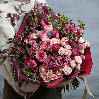 Букет из одиночных, пионовидных и кустовых роз с добавлением маттиолы в стильной упаковке