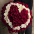 Красные розы, выложенные сердцем по центру. Окантовка сначала белыми розами, потом красными.