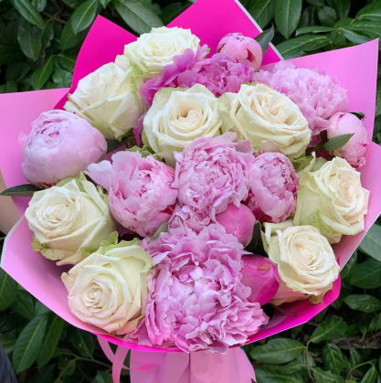Купить пионы и белые розы в упаковке | Цветы с доставкой в Лобне
