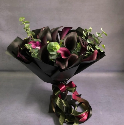 Букет из черничных и темно-розовых калл украшенный ветками эвкалипта в стильной матовой бумаге