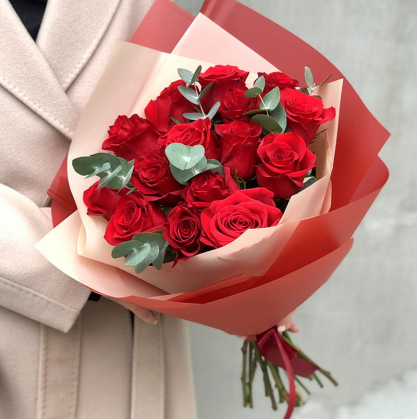 Классическая композиция из роз с эвкалиптом бэби блу. Такой букет несомненно порадует вашего любимого и близкого человека. Делайте яркие моменты, дарите хорошие впечатления. Мы позаботимся о качестве цветов и доставим букет в срок.