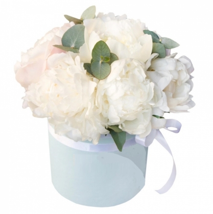 Купить белые пионы в шляпной коробке с доставкой в Лобне