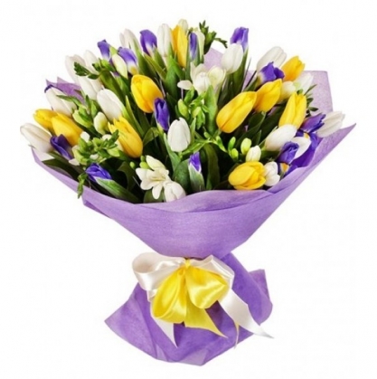 Букет "Три желания" из тюльпанов, ирисов и фрезии | Купить в Лобне